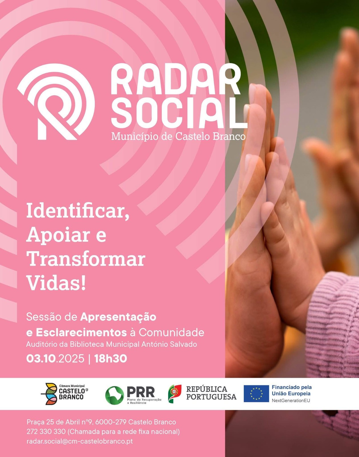 O Projeto Radar Social vai realizar, no próximo dia 3 de outubro de 2025, uma sessão de apresentação e esclarecimentos aberta a toda a comunidade. O encontro terá lugar no Auditório da Biblioteca Municipal António Salvado, em Castelo Branco, a partir das 18h30.