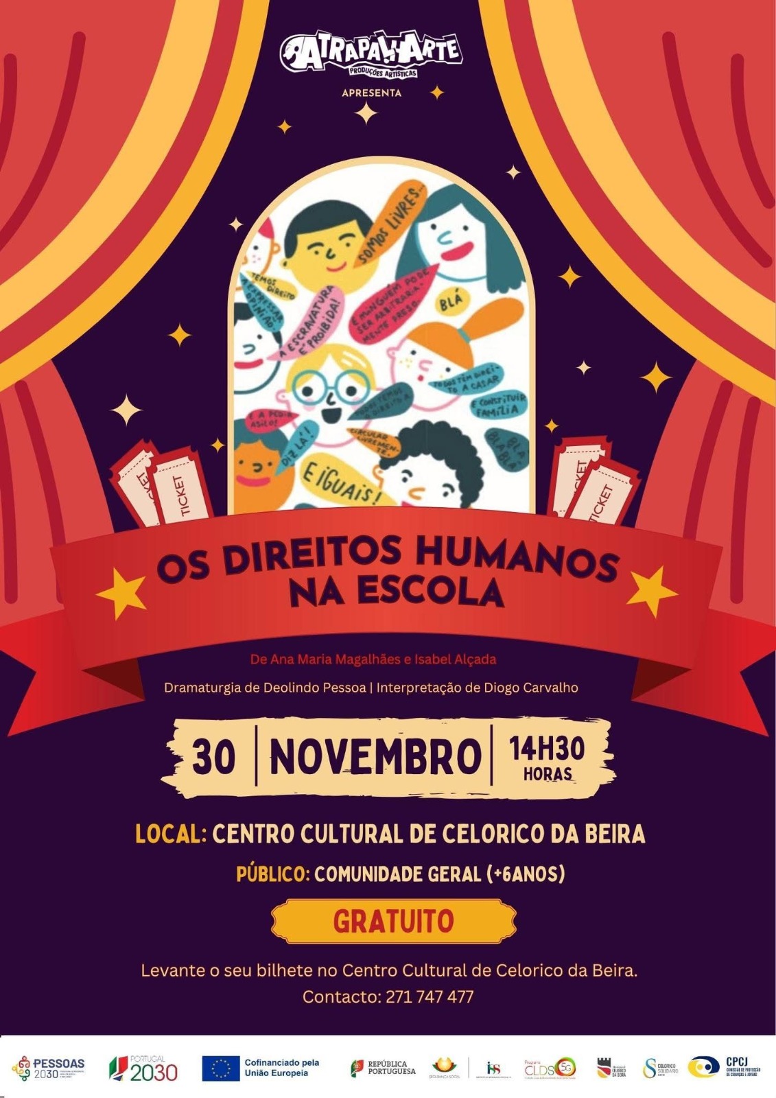 A Comissão de Proteção de Crianças e Jovens (CPCJ) de Celorico da Beira, em colaboração com o Município de Celorico da Beira e o CLDS 5G Celorico Solidário, promove no dia 30 de novembro, às 14h30, no Centro Cultural de Celorico da Beira, o espetáculo teatral “Os Direitos Humanos na Escola”.