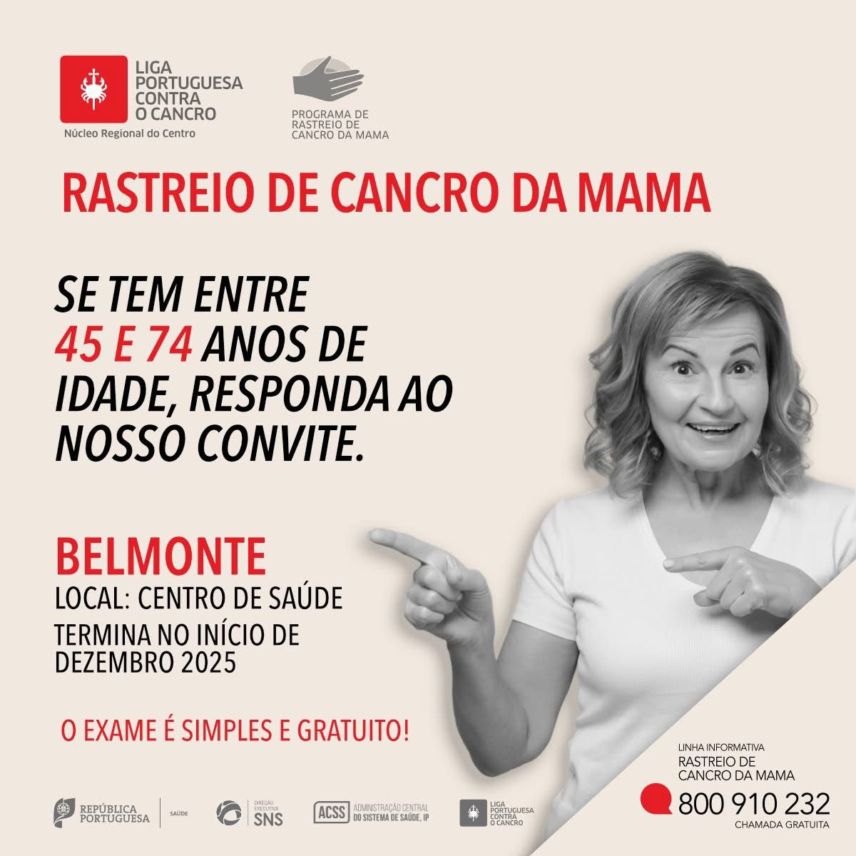 Para mais informações, está disponível a linha gratuita 800 910 232 e o e-mail rcmama.nrc@ligacontracancro.pt.