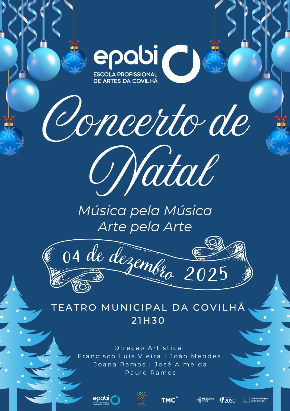 A Escola Profissional de Artes da Covilhã (EPABI) apresenta, no dia 4 de dezembro, às 21h30, o Concerto de Natal intitulado “Música pela Música. Arte pela Arte”, no Teatro Municipal da Covilhã. O espetáculo integra a programação do Natal com Arte, promovido pelo Município da Covilhã.
