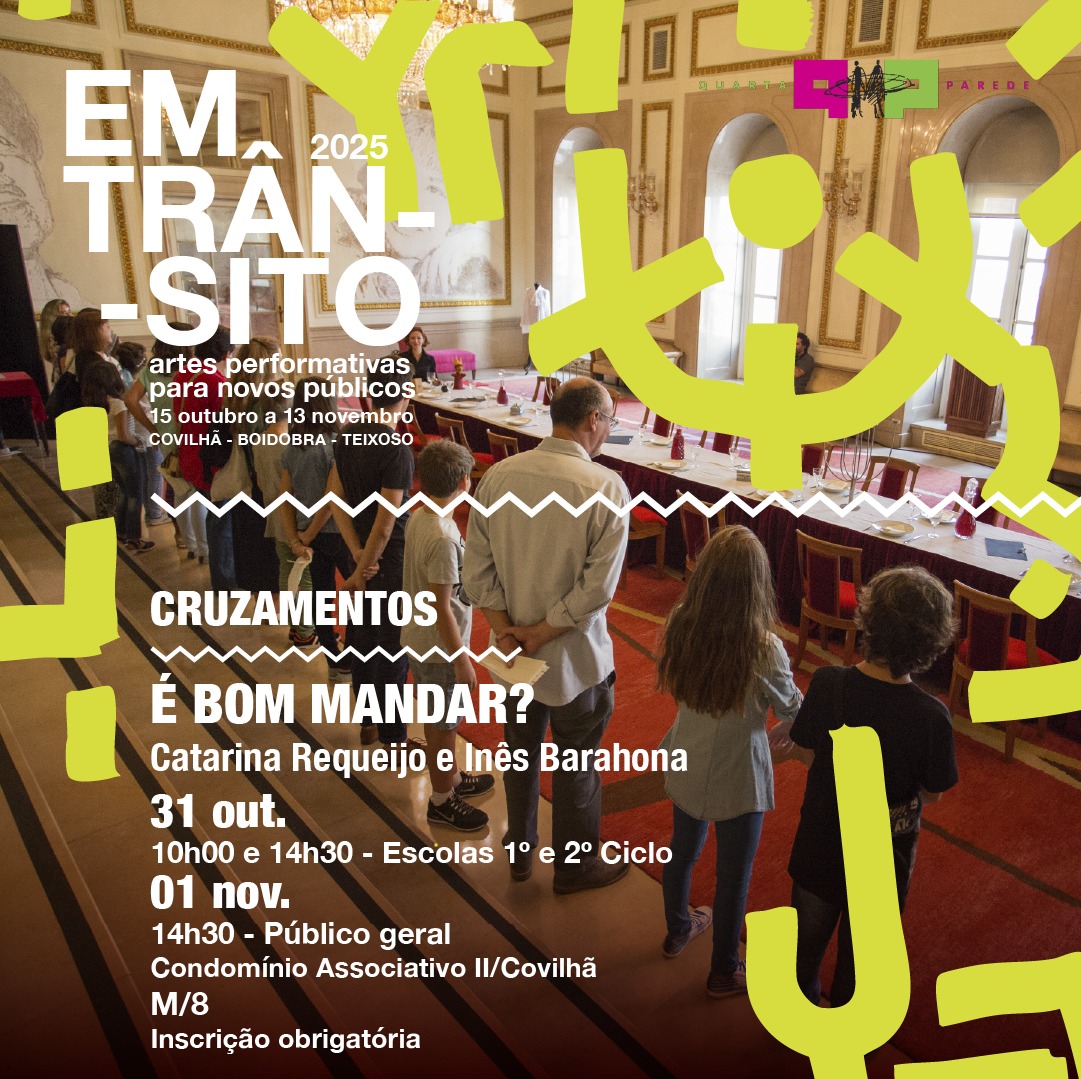 O programa EM TRÂNSITO – artes performativas para novos públicos, promovido pela Quarta Parede, prossegue na Covilhã com o espetáculo-oficina “É Bom Mandar?”, da Formiga Atómica, uma criação de Catarina Requeijo e Inês Barahona que propõe uma reflexão divertida e participativa sobre a política e o poder.