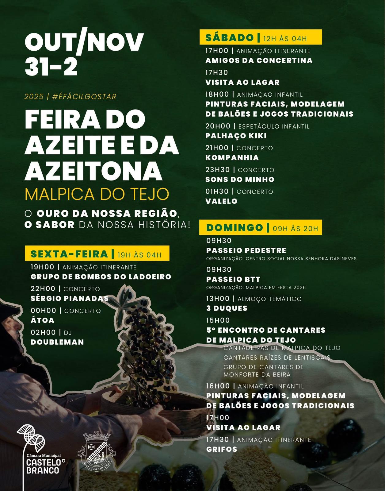 A Feira do Azeite e da Azeitona regressa a Malpica do Tejo, no concelho de Castelo Branco, entre os dias 31 de outubro e 2 de novembro, para celebrar aquele que é conhecido como o ouro da região — o azeite.