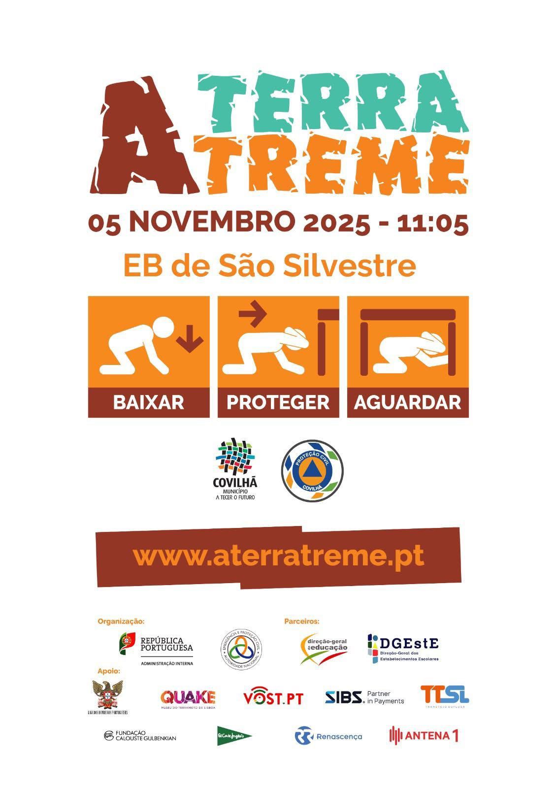 O Município da Covilhã informou que o exercício “A Terra Treme” vai realizar-se no próximo dia 5 de novembro, às 11h05, nas instalações da Escola Básica de São Silvestre.